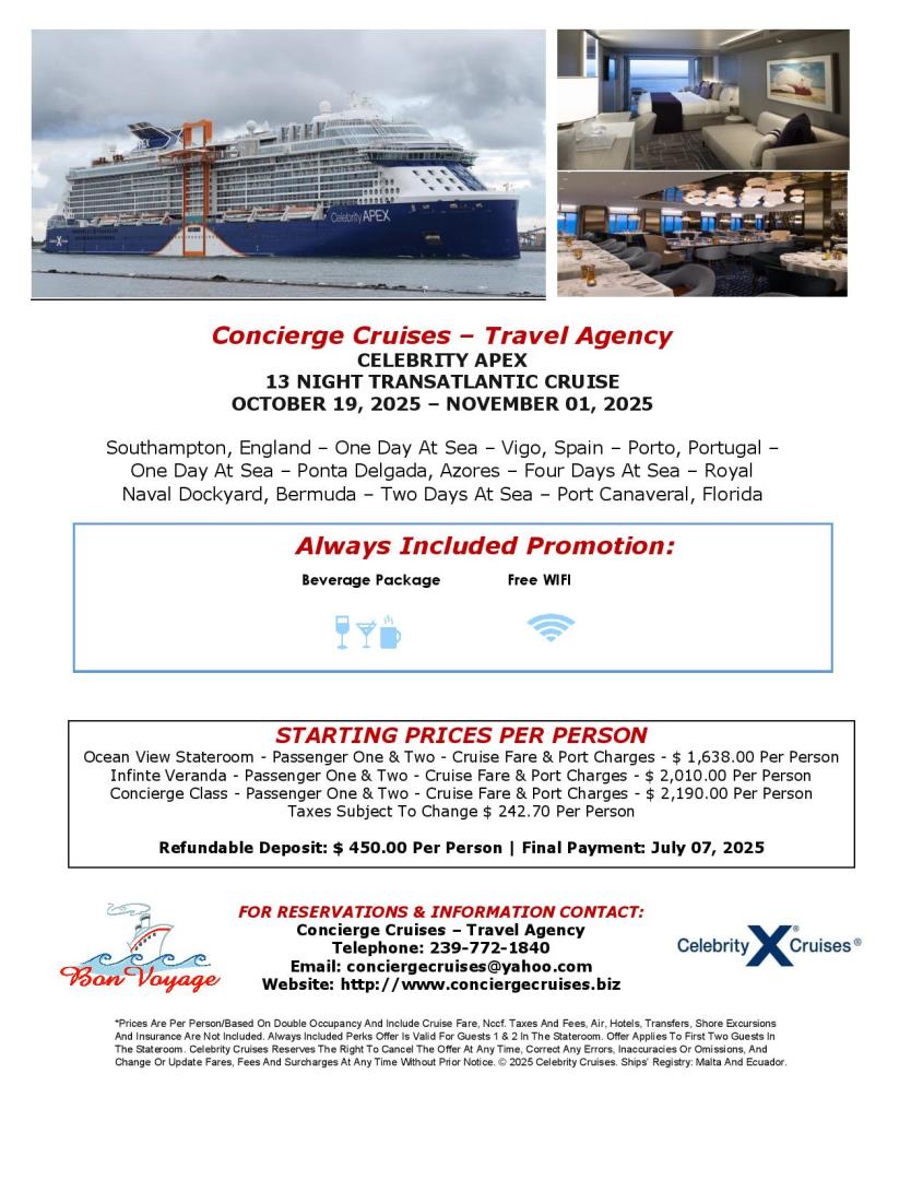 ** Please Click On The Link To View All Information For The Cruises. Please Note The Above Prices Are Subject To Change At Any Time & Subject To Availability. Promotions Can End At Any Time & Without Prior Notice. Promotions Are Up To The Cruise Lines Discretion. Above Prices Do Not Include Air, Hotels, Transfers, Shore Excursions, Transportation, Or Insurance Unless Otherwise Listed. These Are An Additional Cost. Thank You!